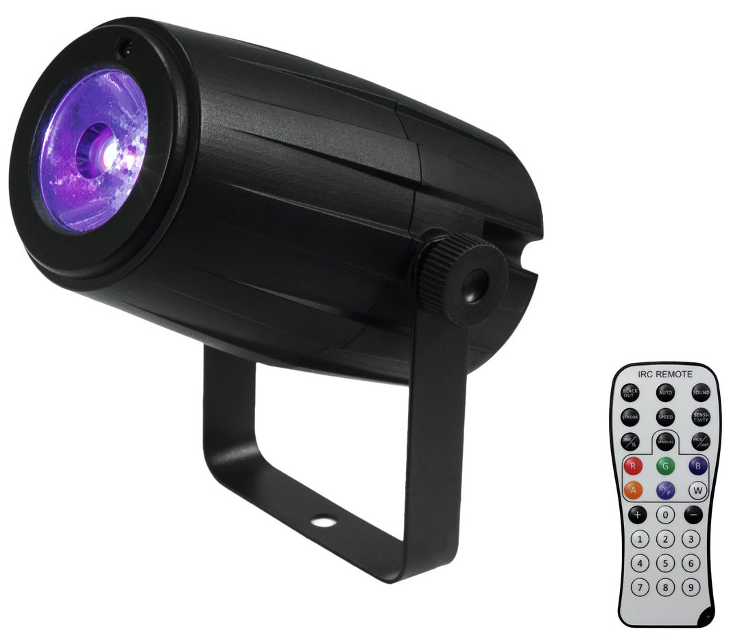 LED RGBW Sport på 5W med strobe effekt – Kan styres med den medfølgende fjernbetjening.