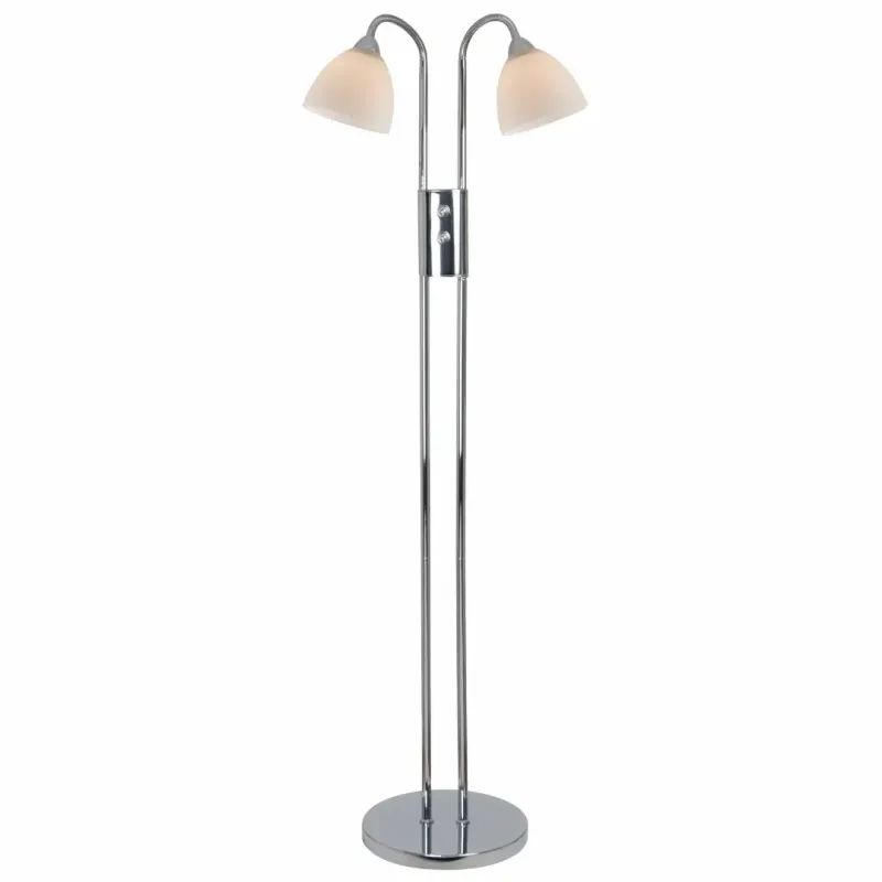 Nordlux Ray 2-Spot – Gulvlampe – Krom Ray dobbelt gulvlampe med to lysdæmpere fra Nordlux er i et meget klassisk og stilfuldt design. Lampen er fremstillet i krom med skærme af glas. De hvide glasskærme giver et blødt og behagelig lys, der passer ind ma